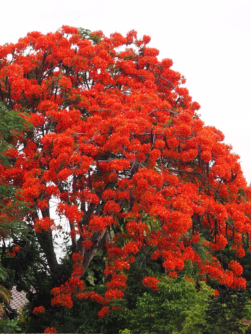 Known and loved for the striking beauty of their bloom, royal poinciana trees are cherished and planted throughout the tropics and subtropics. However, they are endemic to Madagascar, an island nation off the eastern coast of Africa whose climate is similar to south Florida in that it is both warm and characterized by wet and dry seasons. Its discovery in Madagascar is attributed to Wenceslas Bojer in 1824. Seeds were taken first to Mauritius and then to England, as reported enthusiastically in the Curtis Botanical Magazine. Bojer gave the species the botanical name of Poinciana regia, in honor of Philippe de Lonvellier de Poincy, who served as the governor of the French West Indies in the 17th century. The species was later reclassified under the Delonix genus as Delonix regia, but its original name was carried on as its common name of poinciana or royal poinciana. It is also commonly known as flamboyant, flame tree, peacock flower, and queen of the flowers.